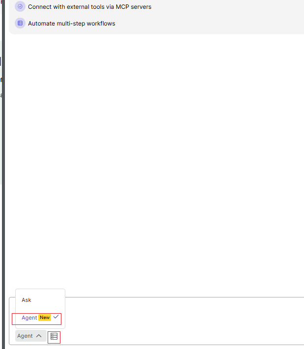 在聊天窗口左下方找到"Chat mode"并切换至"Agent mode"。