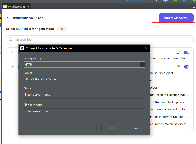 除了系统内置的MCP服务器,Katalon Studio还支持接入外部MCP服务器以扩展AI助手的功能范围。