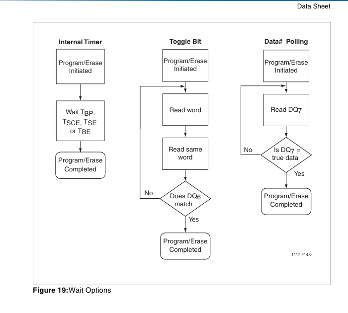 状态检测:操作完成后需要检测Toggle Bit或Data# Polling