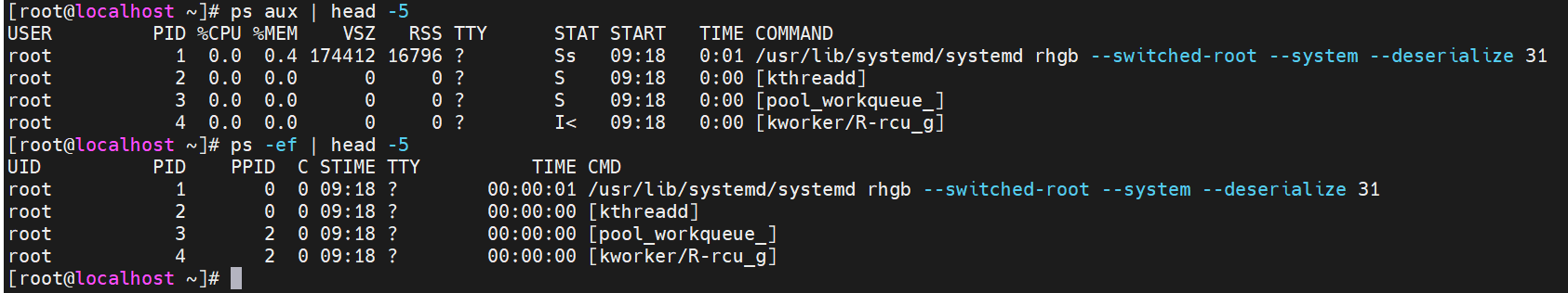 注意点:aux 可以显示cou使用率、内存使用率、虚拟和物理内存大小、进程状态,但-ef不可以
