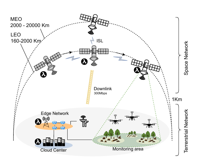 2.1 说明性场景 在偏远地区早期发现森林砍伐需要及时的数据处理和跨三维连续体的异构资源的有效利用。在我们的森林砍伐用例中(图1),地面传感器和无人机收集环境指标,如高分辨率图像、温度和二氧化碳水平。当在范围内时,无人机将数据卸载到附近的边缘节点;否则,它们直接将数据传输到LEO卫星,确保即使在边缘网络不可用时也能保持高可用性。此外,LEO卫星还可以将来自无人机的地面数据与对地观测(EO)卫星(包括光学和红外数据)的图像进行融合。组合后的数据流通过一个无服务器工作流进行处理,该工作流包括数据摄取、图像分割和模式识别函数,以检测森林砍伐热点。通过将这些任务分布在边缘、云和太空,三维连续体减少了数据传输开销,降低了检测延迟,并支持对每日高达1.5TB的大型EO数据集进行可扩展分析,否则将这些数据传输到地面云服务的成本将非常高昂[3, 17]。盖亚通过抽象CPU/GPU硬件选择来增强此工作流,确保资源密集型函数(如对象检测或准备数据集)无缝利用边缘节点或LEO卫星上的可用GPU,而无需开发人员手动指定执行设备。盖亚静态代码分析器在部署时识别具有GPU亲和性的函数,提供执行提示,防止为轻量级函数(如摄取)不必要地分配GPU。此外,盖亚的自适应运行时重配置允许平台在卫星进出轨道或工作负载强度变化时动态重新分配函数,尽管资源可用性波动,仍能保持SLO合规性。因此,盖亚使森林砍伐检测工作流能够在地面链路拥塞时利用星载GPU,或者在GPU容量有限或不可用时回退到CPU,从而优化性能和成本,同时确保无中断的无服务器执行。