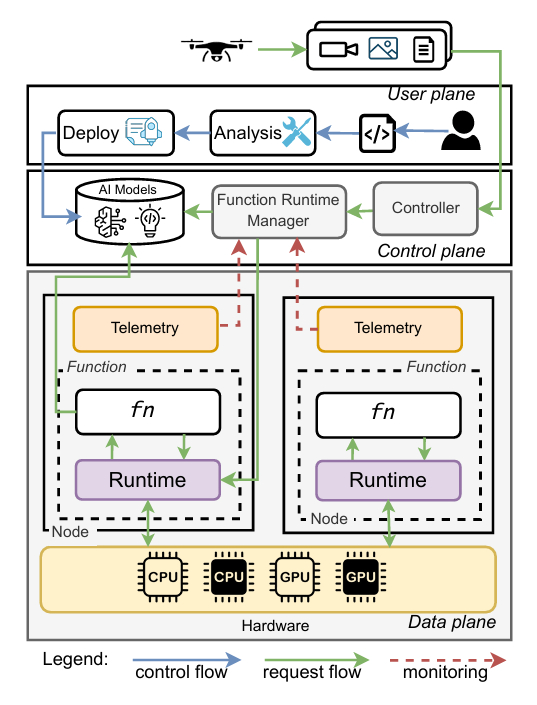 1 引言 无服务器计算提供了弹性扩展和按使用付费的模式,使其非常适合实时数据处理、物联网和AI推理等多种应用[20, 28, 56]。然而,无服务器平台中的硬件加速仍然具有挑战性。函数通常在不知道底层硬件的情况下部署,而开发人员必须手动决定函数应该在CPU还是GPU上运行。将函数静态分配给硬件资源增加了开发人员的复杂性,并且通常导致异构环境下的低效利用,在这些环境中,资源可能无法满足函数需求。