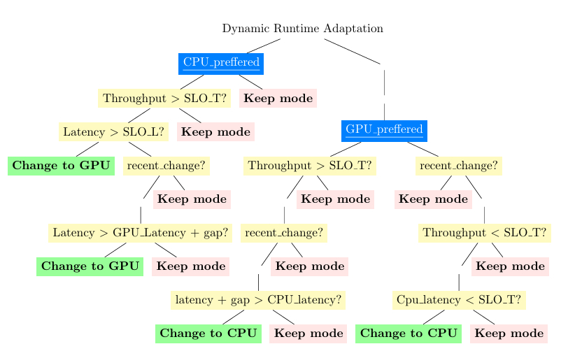 4.2 动态函数运行时适配 动态函数运行时适配持续监控已部署的无服务器函数,并在cpu_preferred和gpu_preferred之间调整它们的执行模式。为了实现这一点,动态函数运行时适配向编排器提供关于函数应在CPU还是GPU上执行的适应性提示;然后编排器处理调度决策。它依赖于从遥测收集的请求速率和延迟指标,以及可配置的阈值,来决定函数是否应该切换其执行环境。这确保了当工作负载证明合理时,函数可以从GPU加速中受益,同时在CPU足够时避免不必要的GPU使用。