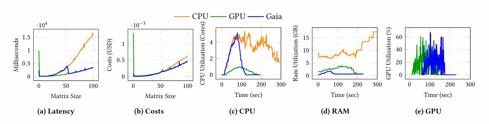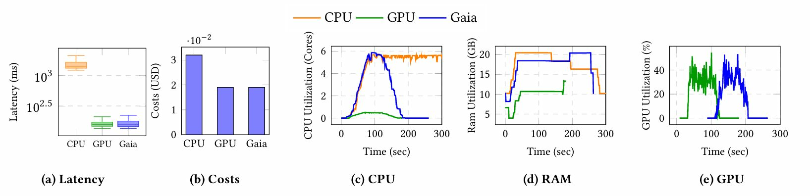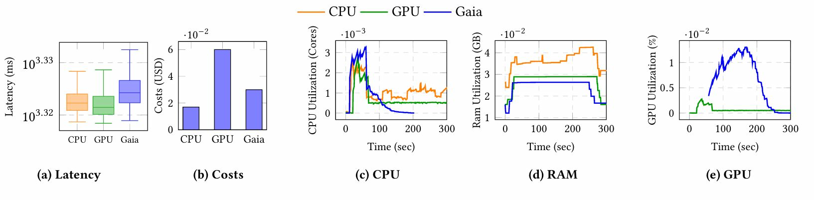 成本:图6b显示,使用测量的总值(CPU: 0.03206, GPU: 0.01914, Gaia: 0.01910),盖亚和GPU比CPU便宜40%。在升级后延迟直接崩溃后(图6a),盖亚和GPU是相同的。