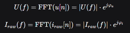 FFT将时域信号分解为一系列复数频率分量。对于经同步采样获得的电压序列 u[n] 和电流序列 Iraw[n],分别进行FFT后,可得到各自的复数表示: