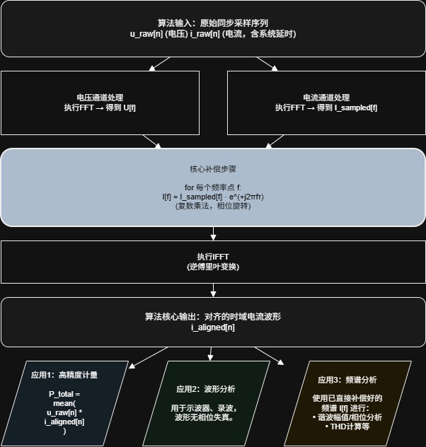 该方法的强大之处在于,它不仅能修正相位用于计算,更能重建出在时域上与电压严格对齐的电流波形,为所有后续分析提供纯净数据源。其完整的数据处理链如下: