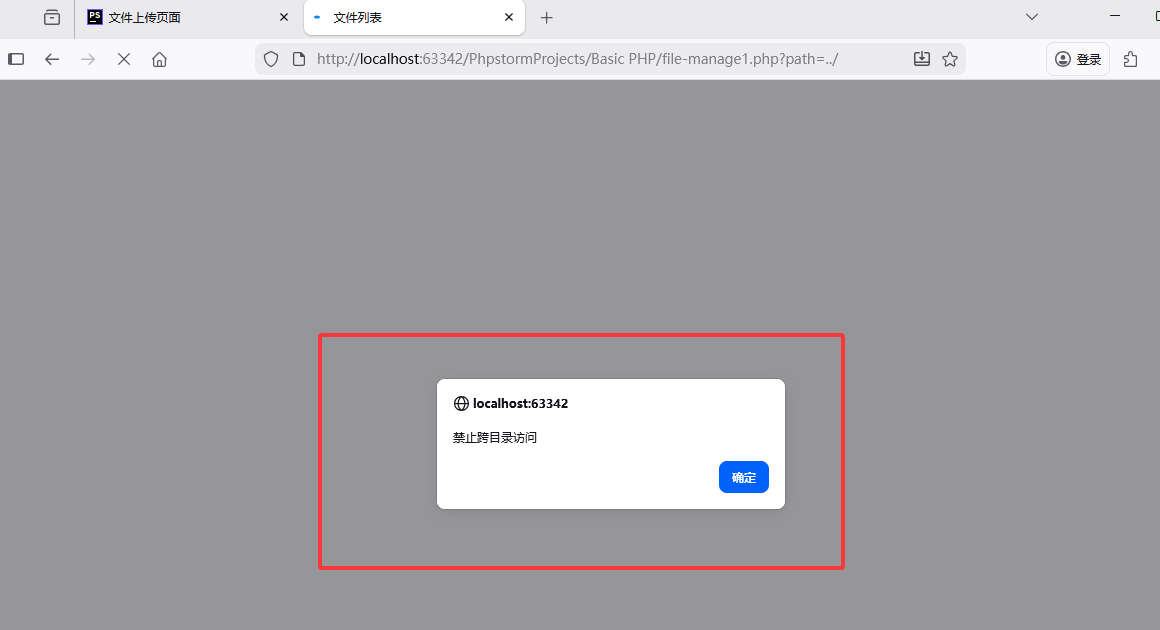 - 如果 <font style="color:rgb(36, 41, 47);background-color:rgba(175, 184, 193, 0.2);">$dir</font> 是 <font style="color:rgb(36, 41, 47);background-color:rgba(175, 184, 193, 0.2);">'../'</font>,就会弹出一个警告框,提示 “禁止跨目录访问”。
