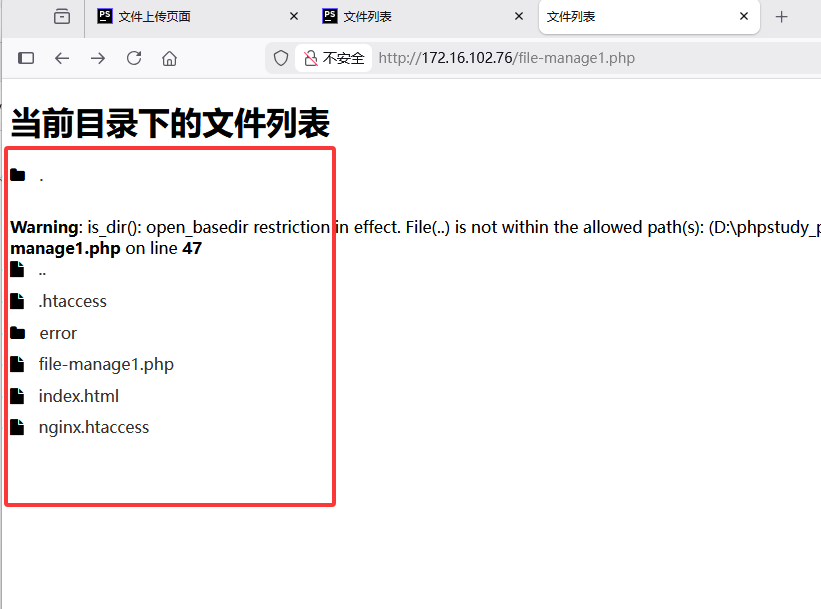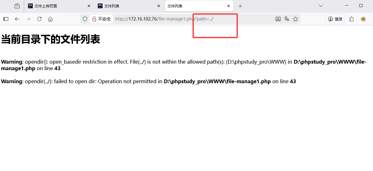 可以发现已经无法读取上一级文件了,并且PHP也给出了报错提示:PHP 给你的脚本设置了 “访问禁区”——只允许你操作 **D:\\phpstudy_pro\\WWW** 这个文件夹里的内容,但你的代码在第 43 行尝试打开 <font style="color:rgba(0, 0, 0, 0.85);">../</font>(也就是 <font style="color:rgba(0, 0, 0, 0.85);">WWW</font> 的上一级文件夹 <font style="color:rgba(0, 0, 0, 0.85);">D:\\phpstudy_pro</font>),这个操作超出了 PHP 允许的范围,所以被拦截了,同时抛出警告告诉你 “操作不被允许”。