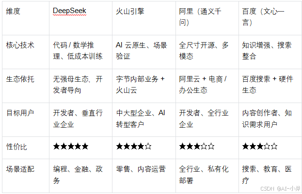 作为技术驱动型初创公司的代表,DeepSeek 以 **“极致性能 + 成本优化”** 打破行业算力依赖,成为垂直领域与开发者市场的黑马。