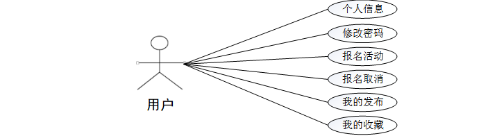 用户模块的主要设计是:在登陆成功后,本系统实现对个人信息、修改密码、报名活动、报名取消、我的发布、我的收藏等功能进行详细操作;