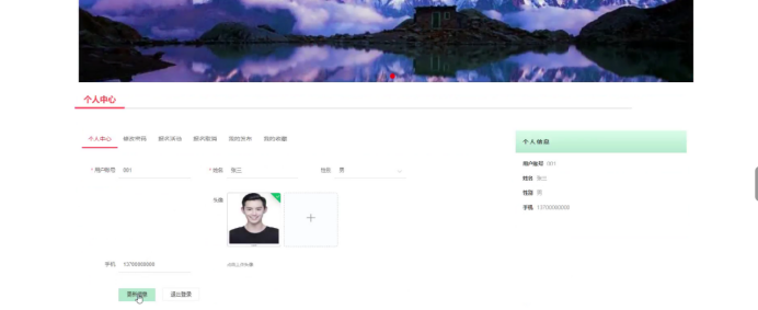 个人中心:在个人中心页面可以对个人信息进行更新操作,还可以对修改密码、报名活动、报名取消、我的发布、我的收藏进行详细操作;如图5-6所示: