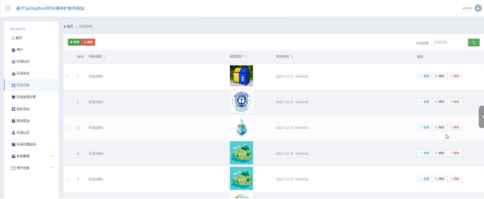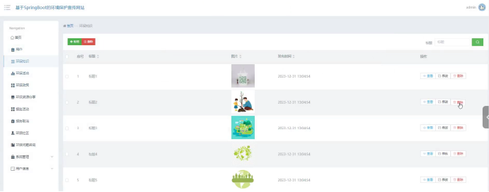 管理员点击环保知识:进入环保知识页面输入标题进行搜索、新增或删除环保知识列表,并根据需要对环保知识详细信息进行查看、修改或删除操作。如图5-10所示: