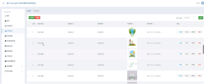 管理员点击环保活动:,进入环保活动页面输入活动主题进行搜索、新增或删除环保活动列表,并根据需要对环保活动信息进行查看、报名、修改或删除操作。如图5-11所示: