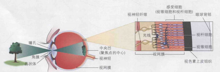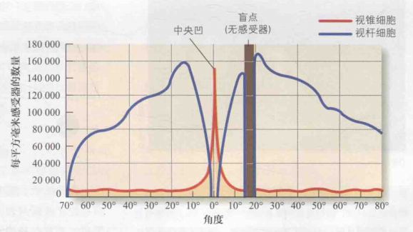 眼球上大约有600万个视锥细胞和1.2亿个视杆细胞。其中,视锥细胞主要集中于极小范围的中央凹区域,并在中央凹处具有密度较高(约5万个),而在外周视网膜上密度较低;相反,视杆细胞则主要分布在大范围的外周视网膜上,如图3(b)所示。