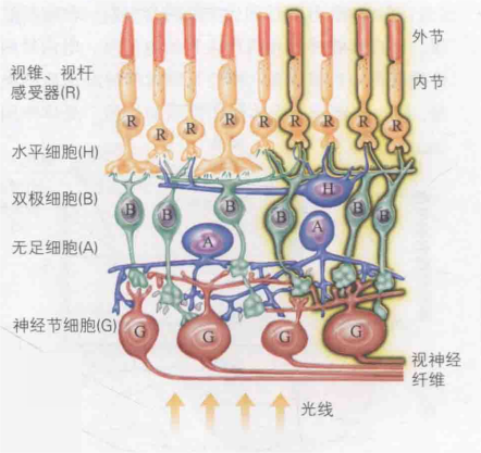 电信号生成后,依次传递至双极细胞和神经节细胞,随后神经节细胞通过视神经纤维(即神经节细胞的轴突,长度较长)将信号传送至大脑。值得注意的是,如图4,双极细胞和神经节细胞覆盖在视觉感受器的外面,此外还分布有水平细胞和无足细胞,光线正是透过这四种神经细胞抵达视觉传感器。另外,视神经纤维从外向内穿过视网膜,形成了一个盲点。然而,这一盲点通过我们大脑的高级神经处理过程得以“脑补”,因此我们感知不到这个盲点的存在。