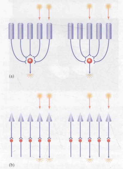 图(b)展示了视锥细胞的神经环路结构,其中每个突触均与相应的神经节细胞相连。当出现两个相邻的光点刺激时(如左图所示),相应的两个相邻神经节细胞会放电。而当将两个光点分开时(如右图所示),对应的两个分离的神经节细胞则会放电。由此可见,不同的光刺激模式会导致不同的神经节放电反应,从而使大脑接收到不同的信号,并据此进行区分。