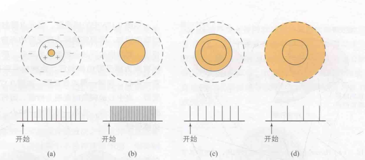 一个感受野可以被划分为兴奋区和抑制区,信号刺激兴奋区会激活神经元反应,而信号刺激抑制区则会抑制反应。当兴奋区的受刺激面积增加时,反应强度也随之增强;相反,抑制区的受刺激面积增大,反应强度则会减弱。如图10所示,该感受野呈现出中心兴奋和周边抑制的特点,其中黄色部分代表受到光刺激的区域。每个感受野下方均标注了神经元对刺激的反应情况。如图(a)所示,当仅有一个小光点刺激时,产生的反应较小;图(b)展示了当整个兴奋区域受到刺激时,反应达到最强;如图(c)所示,随着光点面积继续增大,直至部分周边抑制区受到刺激,反应开始减弱,此图旨在说明中心与周边的拮抗作用;如图(d)所示,当光照覆盖全部周边抑制区时,反应进一步降低。这一现象可以通过侧抑制(9-7:轮廓)的原理来解释。