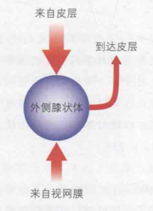 相比视神经纤维,外侧膝状体神经元的感受野只发生了微小的变化。另外,它本身就是一个包含了上百万神经元的复杂结构。因此在外侧膝状体中,总应该有一些事情发生。大脑皮质也会向外侧膝状体传递反馈信号,且要多于来自视网膜的信号,如图11。因此对外侧膝状体有一种猜想:从大脑传递回外侧膝状体的信息可能影响了哪些信息会被上传到大脑。