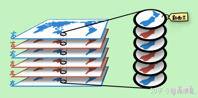 事实上,每层组织与视网膜的拓扑结构都是相同的。以下图13作为说明,把外侧膝状体的每一层,都当作一张世界地图,且每个地图对应位置的图像内容都相同,比如,第一张地图的某个位置是新西兰,其他5张地图的对应位置也是新西兰(来自左眼的信号用红色表示;来自右眼的信号用蓝色表示)。