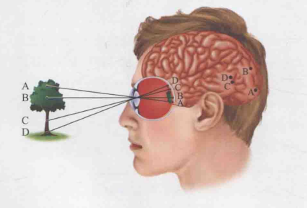 视网膜在大脑皮质上的位置分布图被称为视网膜脑图,它展示了某块皮质与视网膜上特定位置的对应关系。如图16所示,当一个人注视一棵树时,树上的A、B、C、D点分别对他视网膜上的A、B、C、D四点产生了刺激。进一步观察大脑皮层,可以发现视网膜图像中的A点引发了大脑皮层中A点神经元的放电反应,同理,视网膜中的B点引发了B点神经元的放电,以此类推。