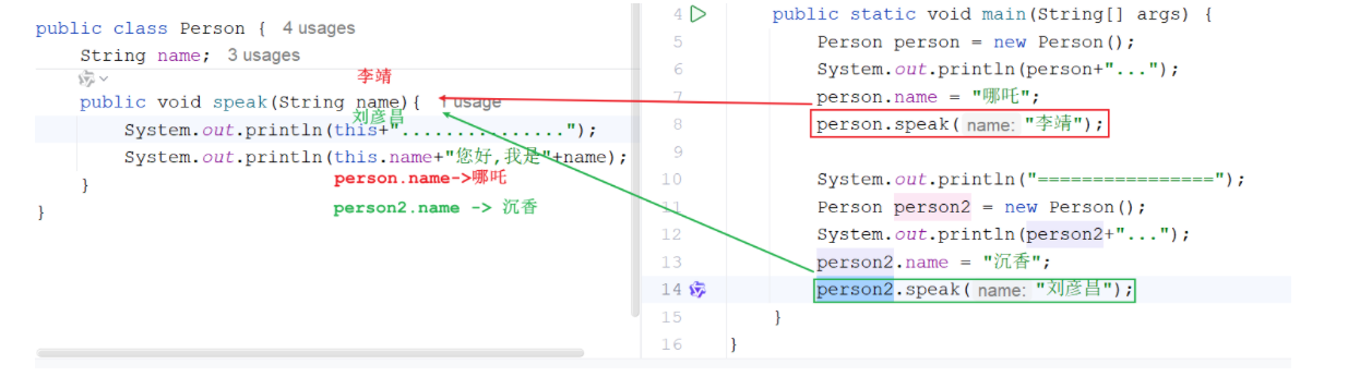 //就是this.name代表String name的值,后边的name代表speak里的值