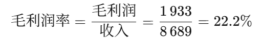 回忆一下,毛利润 = 销售收入 − 产品成本。毛利润率则是毛利润除以收入,结果以百分比表示。以附录中的利润表样例为例: