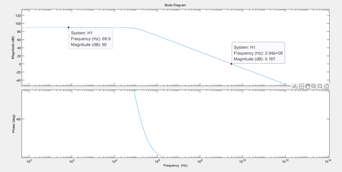 增益设置为90dB,GBW为3GHz,输出最大电流为12mA,跨导gm为20mS,系统波特图,零极点对产生的影响和预期一样,靠得比较近的话基本没有影响。