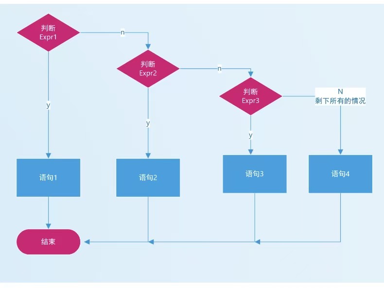 - 如果表达是1,2 为假,就判断表达式3 ,如果为真,执行语句块3. 语句块3 执行完,整个if 结束。