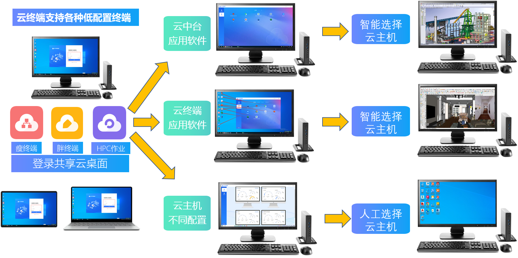 1.云桌面管理软件:在终端部署云飞云共享云桌面管理软件,支持≥10个并发用户会话,每个用户拥有独立操作桌面环境。集中管理算力、软件和数据资源,形成统一资源池。支持动态资源分配与负载均衡,避免单点过载。