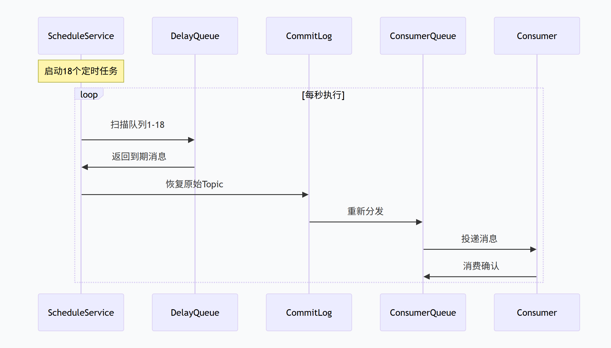 到期后,将消息的主题和队列ID恢复为原始值,然后重新投递到CommitLog中,之后消息会被分发到原始主题的队列中,供消费者消费。