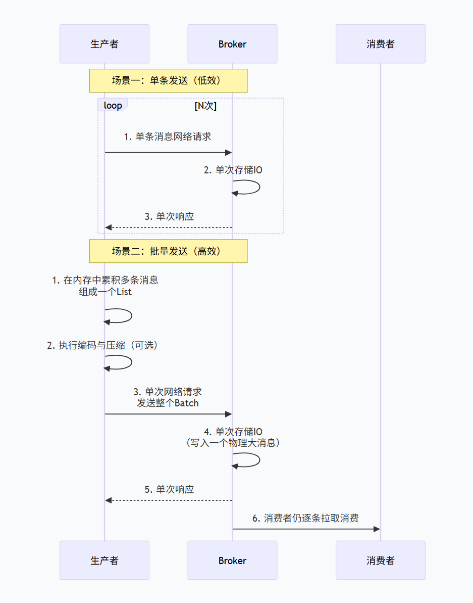核心价值:将多次网络往返(RTT)、多次序列化、多次存储系统调用的开销,压缩为一次,从而在发送大量小消息时,带来巨大的性能提升。