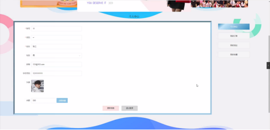个人中心:在个人中心页面通过填写个人详细信息进行信息更新操作,还可以对我的订单、我的地址、我的收藏进行相应操作;如图5-4所示: