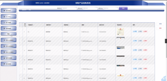 管理员点击商家管理。在商家页面输入商家账号、商品名称和商家地址进行查询、新增或删除商家列表,并根据需要对商家详情信息进行详情、修改或删除操作;如图5-8所示: