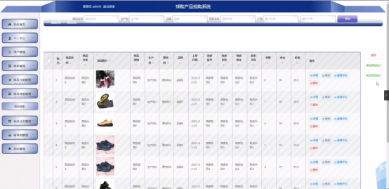 管理员点击商品信息管理。在商品信息页面输入商品名称、生产地、品牌、商家名称、价格进行查询、删除、商品类型统计和商品库存统计商品信息列表,并根据需要对商品详情信息进行详情、修改、查看评论或删除操作;如图5-10所示: