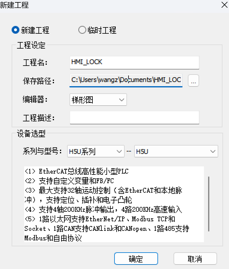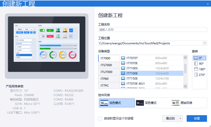 4:在汇川的触摸屏编辑软件InoTouchPad中,新建工程,工程名为HMI1,设备类型选择IT7100E,。