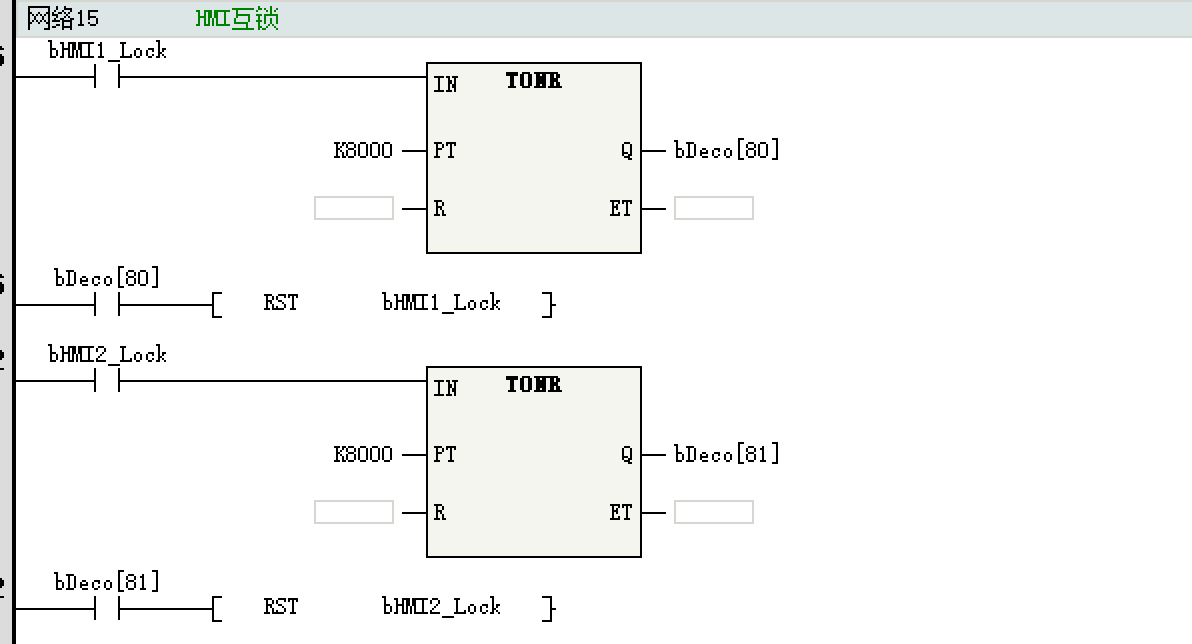 3:在MAIN程序中,做个简单的自复位bHMI1_Lock和bHMI2_Lock两个变量,防止两个变量同时ON,无法互锁。