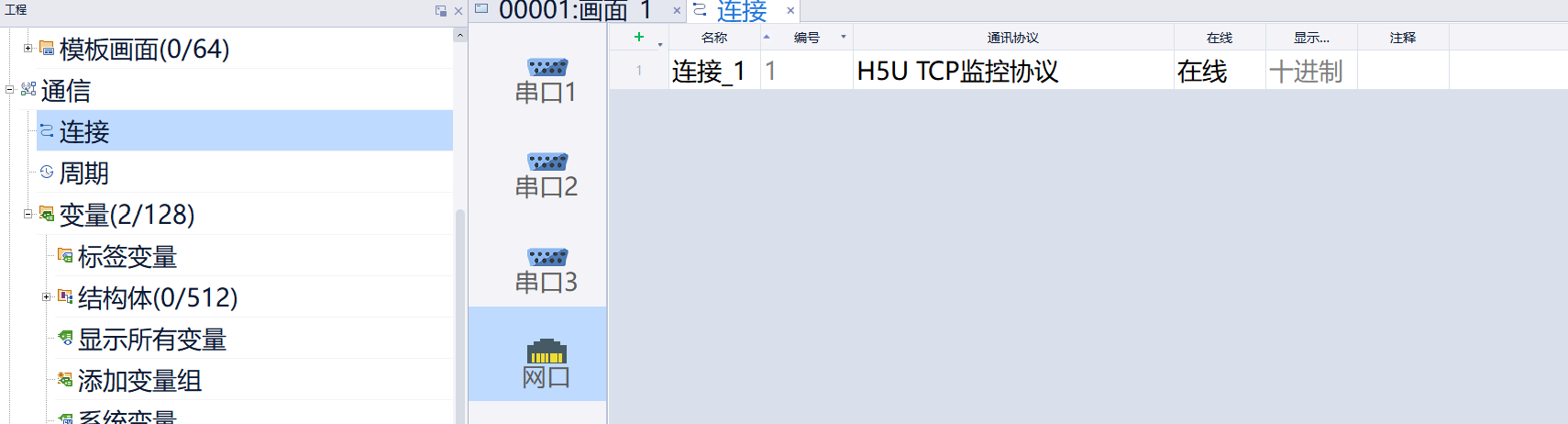 6:在通信-连接-网口,点击小加号,可以添加一个连接_1,选择通讯协议为:H5U_TCP监控协议