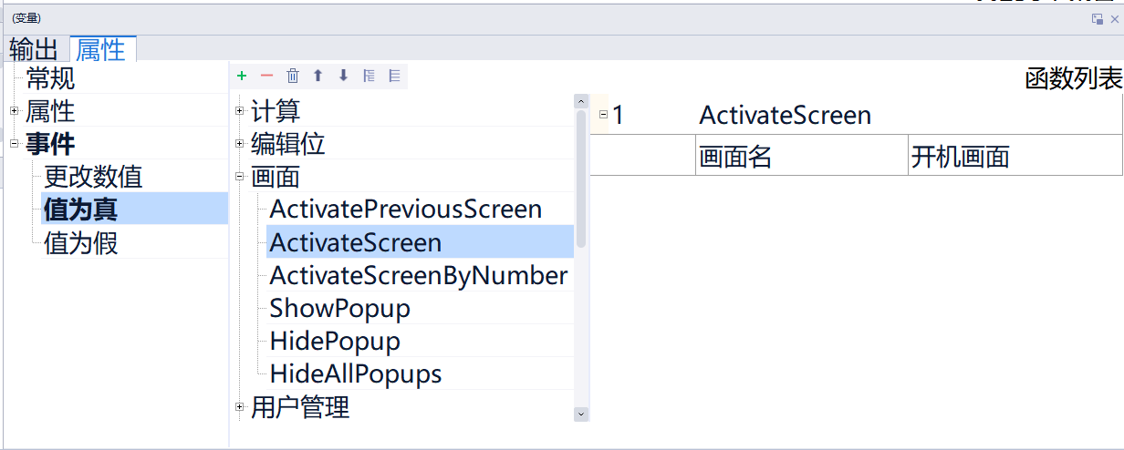 8:把bHMI1_Lock的属性,事件,值为真时,添加函数ActivateScreen,选择画面名为我们前面做的“开机画面”。