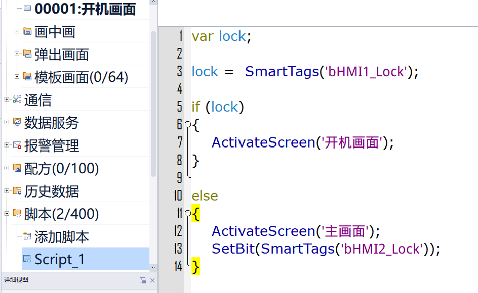 脚本1的功能是::读取bHMI1_Lock的状态,如果是1,则画面跳到开机画面,如果是0,则画面跳到主画面并把bHMI2_Lock置位。这是实现两个屏,互锁的关键脚本。