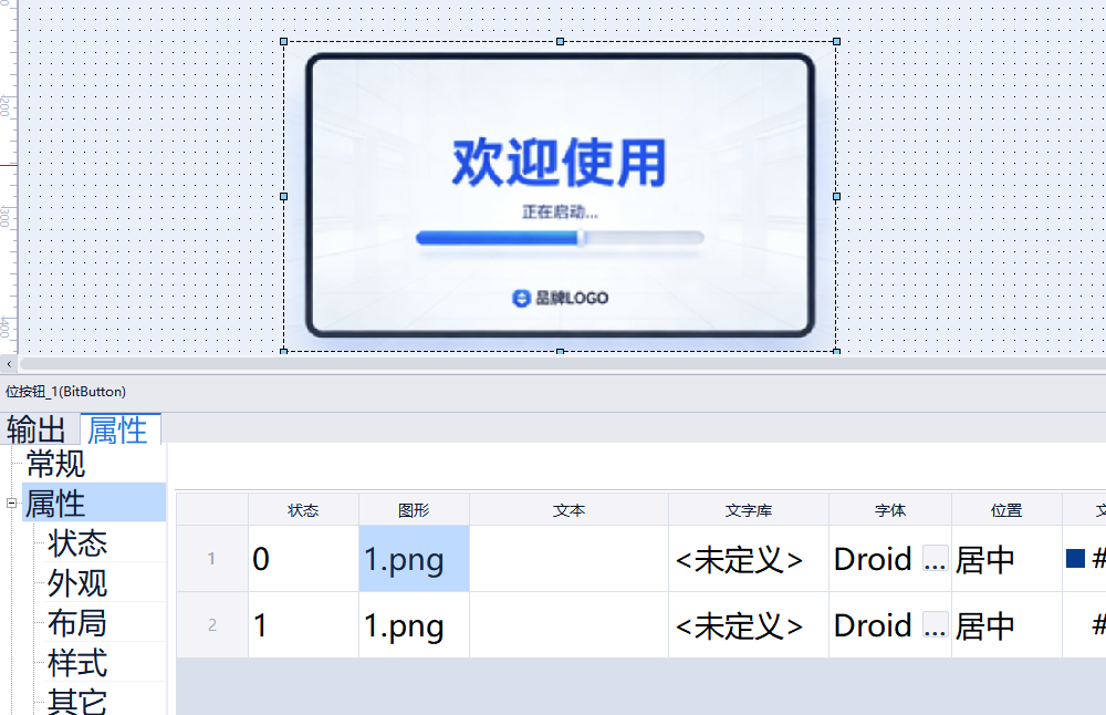 10:在开机画面中,添加位按钮,在属性,状态,图形,选择自己的图片。