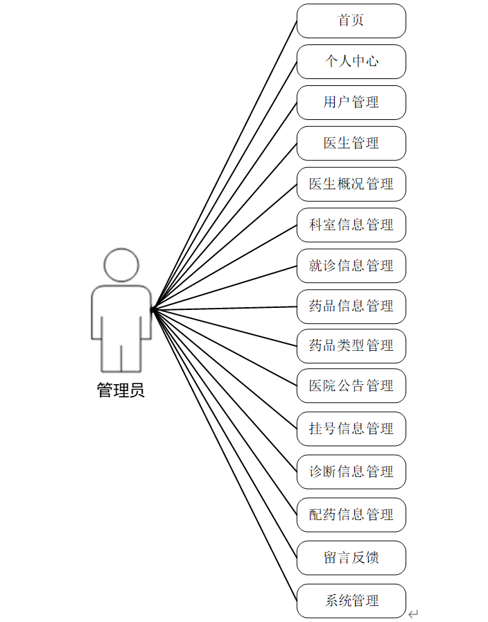 (1)管理员可以对首页,个人中心,用户管理,医生管理,医生概况管理,科室信息管理,就诊信息管理,药品信息管理,药品类型管理,医院公告管理,挂号信息管理,诊断信息管理,配药信息管理,留言反馈,系统管理等进行基本的信息管理。用例分析如图3-1所示。
