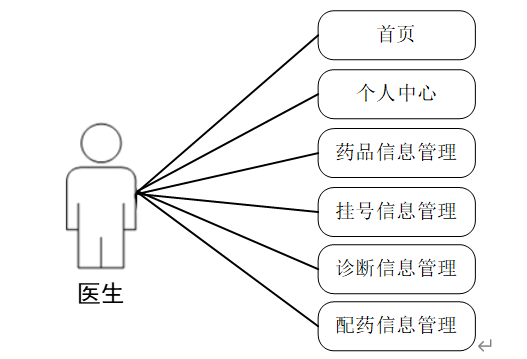 (2)医生可以实现对首页,个人中心,药品信息管理,挂号信息管理,诊断信息管理,配药信息管理等信息进行操作,用例分析如图3-2所示。