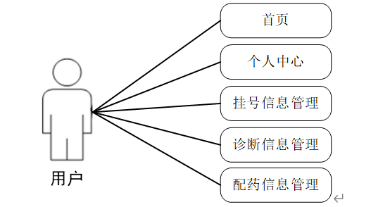 (3)用户可以实现对首页,个人中心,药品信息管理,挂号信息管理,诊断信息管理,配药信息管理等信息进行操作,用例分析如图3-3所示。