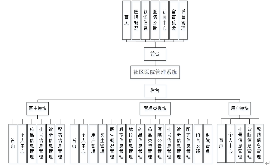 社区医院管理系统的建设可以为社区医院管理提供帮助,通过对一些基础信息管理实现针对性的安排,可以按照用户的角色权限使不同用户角色看到不一样的信息界面。现根据需求阶段的分析,我们可以大致确定系统需要包含的功能如下图所示: