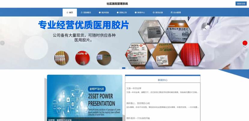 当人们打开系统的网址后,首先看到的就是首页界面。在这里,人们能够看到社区医院管理系统的导航条和新闻中心等。系统首页界面如图5-1所示: