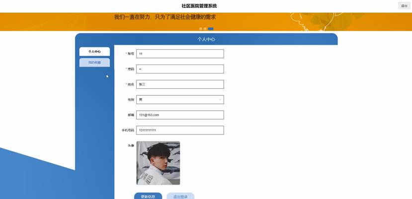 在个人中心页面可以查看个人中心和我的收藏详细信息,点击进入个人中心详情页面可以对个人信息就行更新、返回列表操作;页面如图5-5所示: