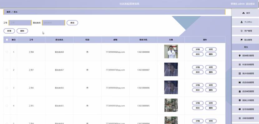 管理员点击医生管理。进入医生页面输入工号、医生姓名可以对医生管理列表信息查询,新增或删除列表,并可以对医生管理详细信息进行查看详情,排版,修改和删除等操作。如图5-8所示: